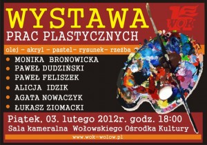 Zapraszamy na kolejną wystawę zbiorczą plastyków z Wołowa i okolic. Tym razem swoje prace zaprezentują: Monika Bronowicka, Paweł Dudziński, Paweł Feliszek, Alicja Idzik, Agata Nowaczyk i Łukasz Ziomacki. Większość autorów będzie po raz pierwszy przedstawiała swoje prace w naszym ośrodku. Prace wykonane są w różnych technikach i poruszają rozmaite tematy.
