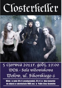 W niedzielę , 5 czerwca będziemy mieli okazję gościć w Wołowie zespół Closterkeller! Koncert odbędzie się w sali widowiskowej WOK . Start o godz. 19:00. jako support wystąpi wołowski zespół Fishdick.