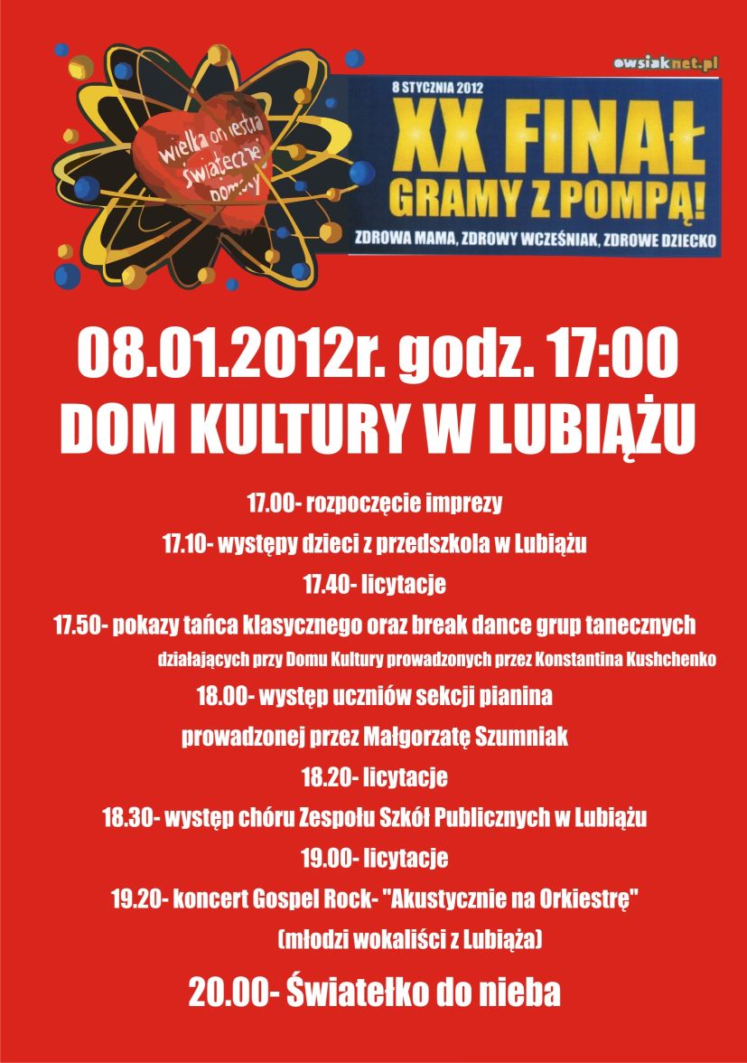 Wielka Orkiestra Świątecznej Pomocy zagra również w Domu Kultury w Lubiążu. Obok prezentujemy plakat ze szczegółowym programem.