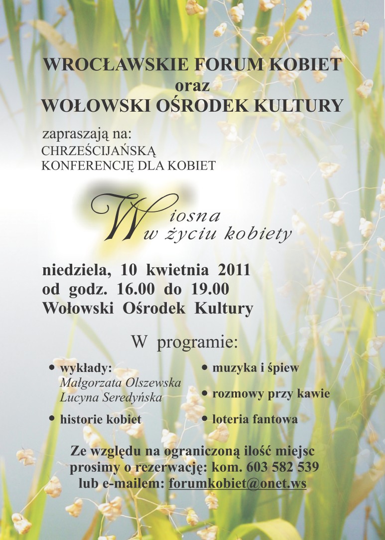 Wraz z Forum Kobiet z Wrocławia zapraszamy na konferencję chrześcijańską , która odbędzie się w sali widowiskowej WOK w niedzielę o godz. 16:00