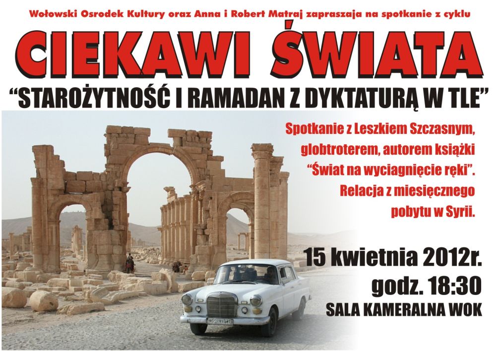 W niedzielę, 15 kwietnia o godz. 18:30 odbędzie się kolejne spotkanie z cyklu „Ciekawi Świata”. Tematem spotkania z podróżnikiem Leszkiem Szczasnym będzie „Starożytność i Ramadan z dyktaturą w tle”.