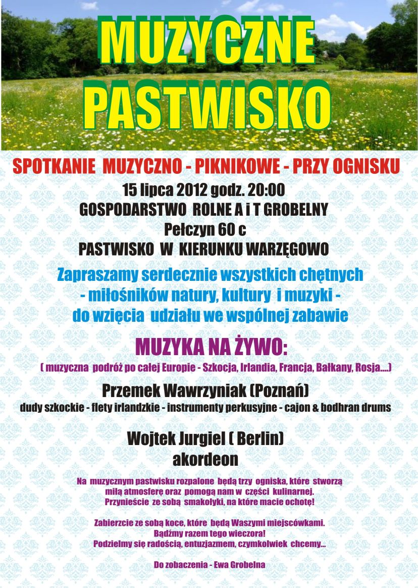 Niezwykle miło jest nam zaprosić Państwa na bardzo ciekawą imprezę jaką niewątpliwie będzie Muzyczne Pastwisko organizowane przez Panią Ewę Grobelną z Pełczyna.