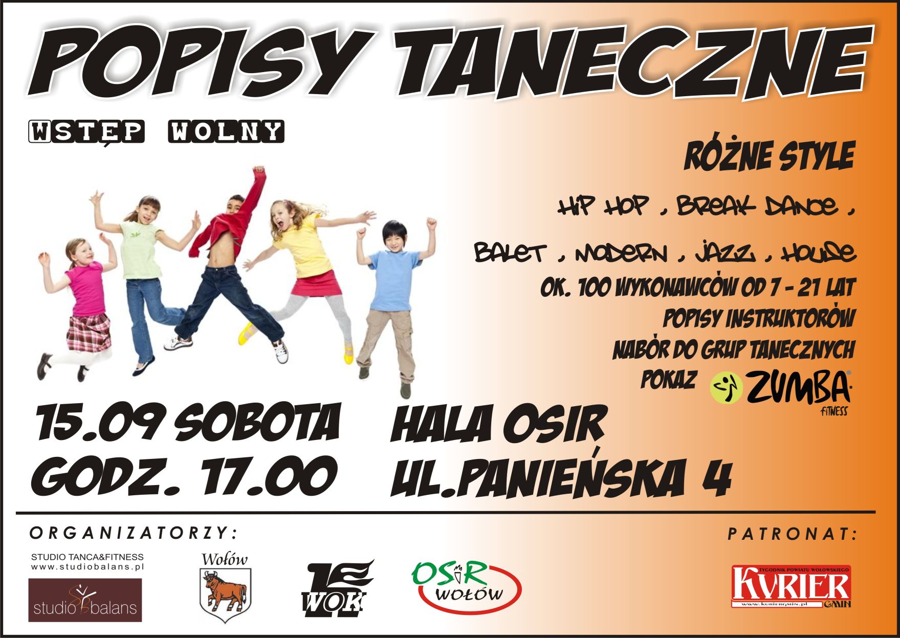 Serdecznie zapraszamy Państwa na popisy taneczne tancerzy Studia Balans. Wystąpią różne grupy wiekowe i zaprezentują różne style taneczne. Serdezcnei zapraszamy na hale OSiR przy ul. Panieńskiej w sobotę, 15 września o godz. 17.00. Wstęp wolny.