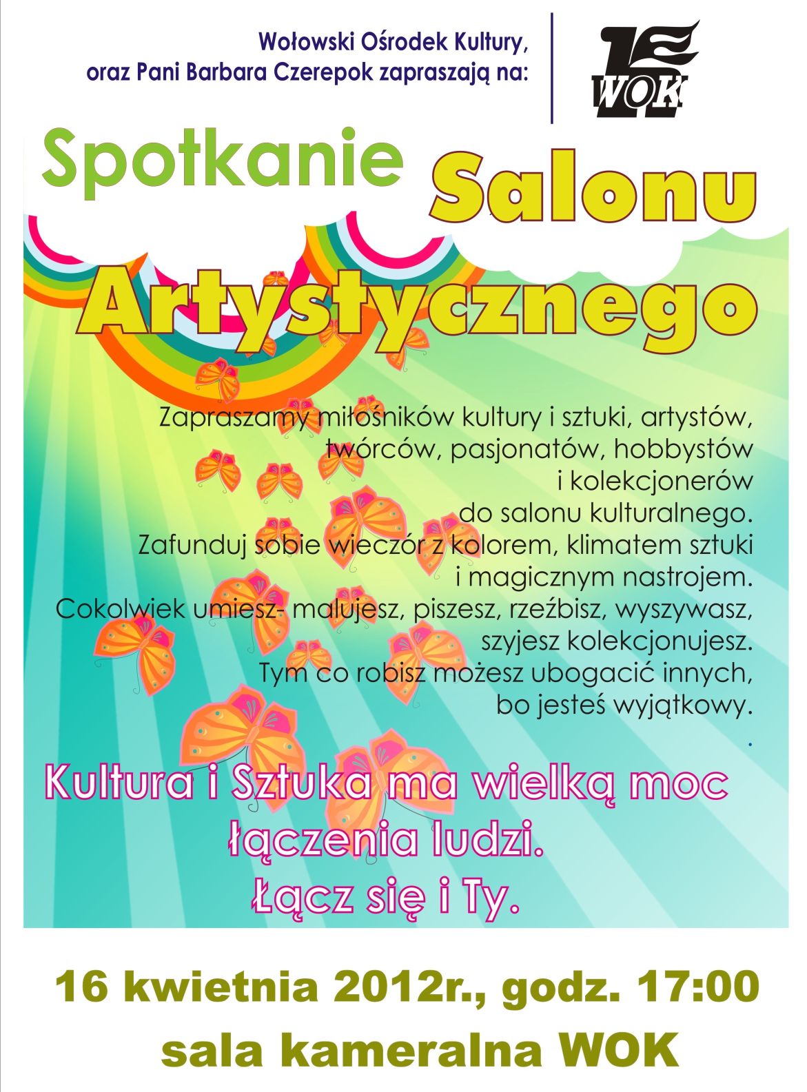 Wraz z Panią Barbarą Czerepok zapraszamy na inaugurujące spotkanie Salonu Artystycznego, skupiającego wszystkich ludzi wrażliwych i zainteresowanych kulturą. W szczególności zapraszamy miłośników sztuki, artystów, twórców, pasjonatów, hobbystów i kolekcjonerów.