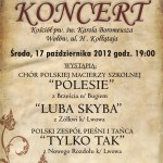 Chór Polskiej Macierzy Szkolnej „POLESIE” z Brześcia n/ Bugiem, „LUBA SKYBA” z Żółkwi k/ Lwowa, Polski Zespół Pieśni i Tańca „TYLKO TAK” z Nowego Rozdołu k/ Lwowa wystąpią podczas koncertu w w najbliższą środę tj. 17 października w Kościele pw. Karola Boromeusza o godz. 19.00 .
