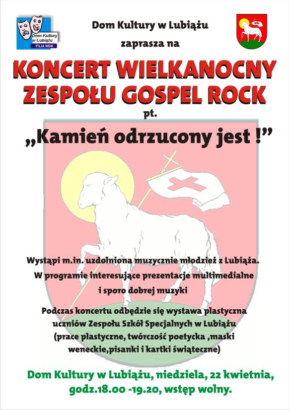 Serdecznie zapraszamy do Lubiąża  na  Koncert Wielkanocny w  wykonaniu zespołu Gospel Rock. Koncertowi  będzie towarzyszyć wystawa prac plastycznych.