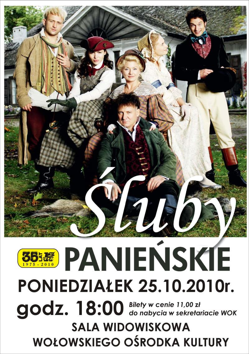 W poniedziałek, 25.10. o godz. 18:00 w sali widowiskowej WOK odbędzie się projekcja filmu „Śluby Panieńskie”. Bilety w cenie 11 zł można nabyć w sekretariacie Wołowskiego Ośrodka Kultury.