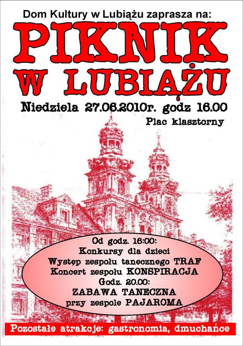 Początek lata w Lubiążu przywitamy piknikiem na placu przy klasztorze. Zapraszamy wszystkich w niedzielę, 27.06.2010r. od godz. 16:00
