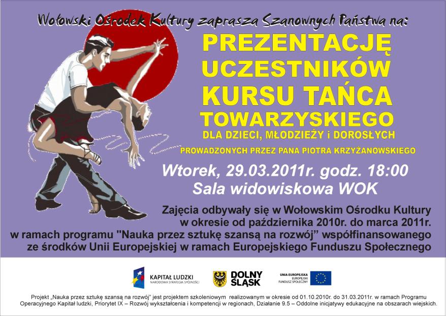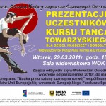 We wtorek 29 marca o godz. 18:00 na sali widowiskowej WOK odbędzie się pokaz uczestników kursu tańca towarzyskiego. Będzie to podsumowanie kursu jaki miał miejsce od października ubiegłego roku w ramach programu „Nauka przez sztukę szansą na rozwój” współfinansowanego ze środków Unii Europejskiej w ramach Europejskiego Funduszu Europejskiego.