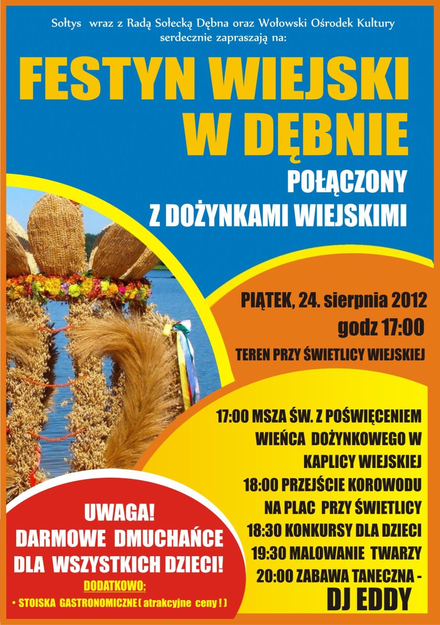 Serdecznie zapraszamy na festyn wiejski do Dębna – tym razem będzie to festyn połączony z wiejskimi dożynkami.