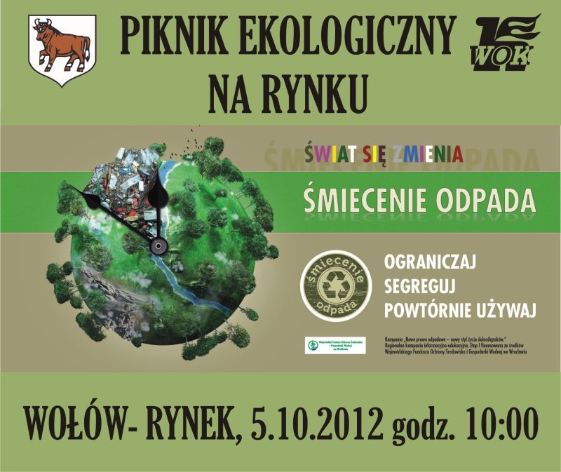 Serdecznie zapraszamy na wołowski Rynek w dniu 5.10.2012 roku o godzinie 10.00 na piknik ekologiczny. Podczas pikniku prezentować się będą: Przedsiębiorstwo Gospodarki Komunalnej w Wołowie, które udostępni do obejrzenia specjalistyczne samochody oraz umożliwi zapoznanie się ze szczegółami na temat pracy przedsiębiorstwa, Nadleśnictwo Wołów, szkolne Ligi Ochrony Przyrody, Stowarzyszenie Osób Niepełnosprawnych w Wołowie, Przedsiębiorstwo POMET oraz Fundacja „Złote Psy”, która zaprezentuje materiały związanie z akcją: ”Posprzątaj po swoim pupilu”.
