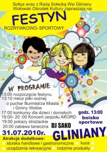 Sołtys wraz z Radą Sołecką wsi Gliniany oraz Wołowski Ośrodek Kultury zapraszają na festyn, który odbędzie się 31 lipca w Glinianach w programie wiele atrakcji.