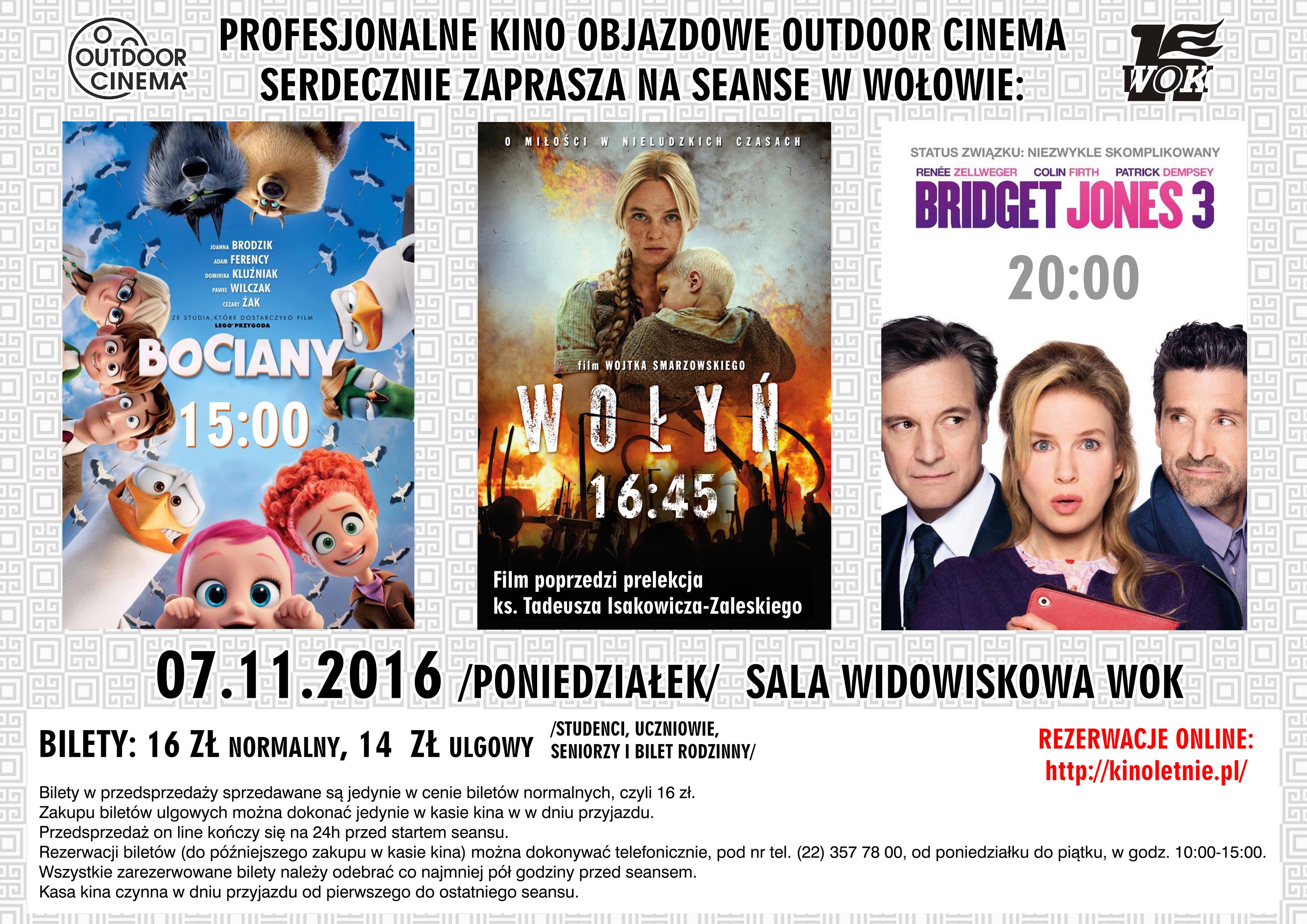07 listopada 2016r. ponownie zawita do Wołowa kino objazdowe „Outdoor Cinema”, które tym razem zaprezentuje Państwu trzy najnowsze hity filmowe – „Bociany”, „Wołyń” oraz „Bridget Jones 3”. Seanse odbędą się o godz 15:00, 16:45 oraz 20:00.