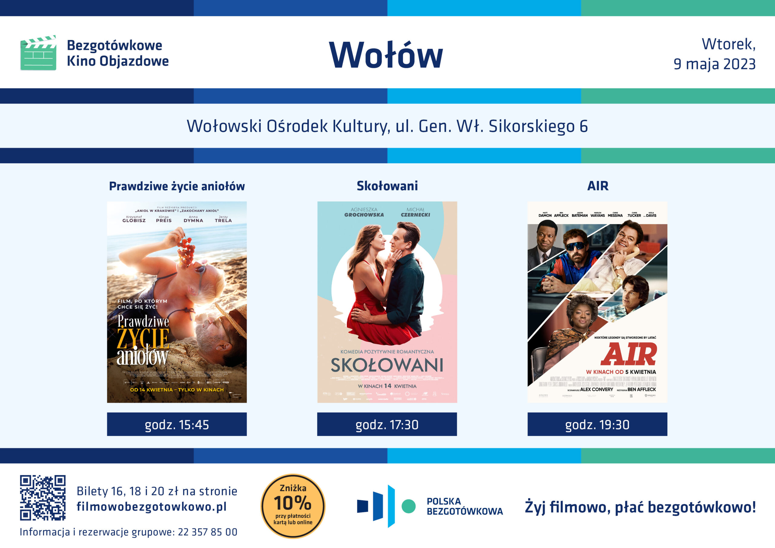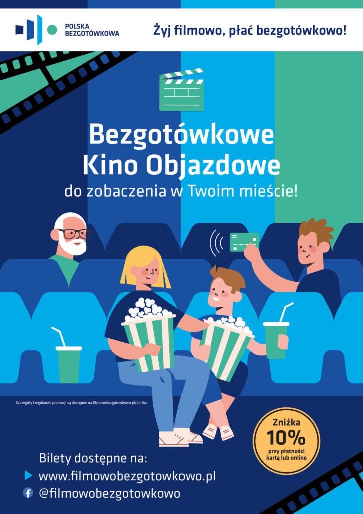 Podczas naszej trasy mamy specjalną zniżkę dla wszystkich fanów kina. Każdy kto zakupi bilet bezgotówkowo – online za pośrednictwem naszej strony www.filmowobezgotowkowo.pl lub za pomocą karty, telefonu lub zegarka w kasie kina – otrzyma na niego 10% zniżki.
