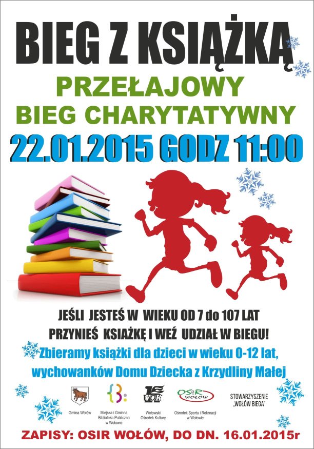 Wspólnie z Miejską i Gminną Biblioteką Publiczną oraz Ośrodkiem Sportu i Rekreacji w Wołowie zachęcamy do wzięcia udziału w „Biegu z książką”. Regulamin biegu oraz inne niezbędne dokumenty można pobrać ze strony na www.osirwolow.pl