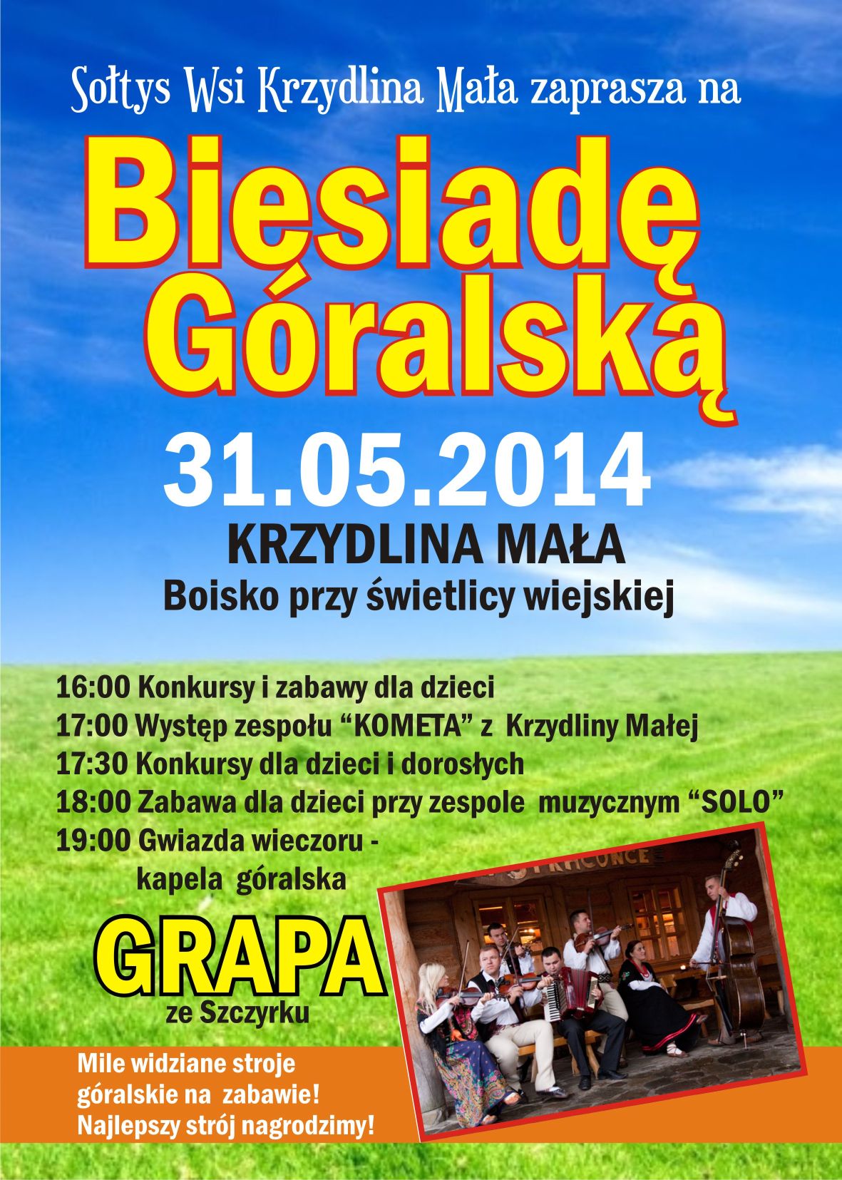 Wspólnie z Sołtysem Krzydliny Małej serdecznie zapraszamy w sobotę 31 maja 2014 na wyjątkowy festyn – Biesiadę Góralską, na której zagra zespół góralski GRAPA. Oprócz gwiazdy wieczoru w programie zabawy i konkursy dla dzieci i dorosłych oraz koncert zespołów Kometa i Solo. Serdecznie zapraszamy!
