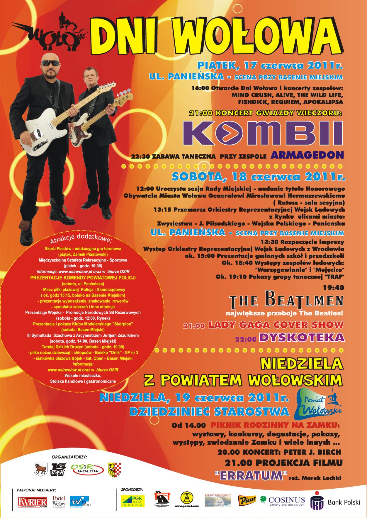 Zapraszamy na Dni Wołowa, które odbędą się w dniach 17- 19 czerwca. Będzie to wspólne święto wszystkich mieszkańców naszej gminy organizowane wspólnie z Urzędem Miasta, Ośrodkiem Sportu i Rekreacji w Wołowie, Starostwem Powiatowym i Komendą Powiatową Policji. Główną gwiazdą będzie występ zespołu KOMBII, jednak w programie znajdą się również występy lokalnych zespołów, szkół itp. W ramach Dni Wołowa odbędzie się wiele imprez towarzyszących.