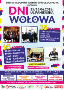 Burmistrz Gminy Wołów Dariusz Chmura wraz z Wołowskim Ośrodkiem Kultury oraz Ośrodkiem Sportu i Rekreacji zapraszają na oficjalne rozpoczęcie jednego z największych wydarzeń organizowanych przez nasze miasto. Dni Wołowa odbędą się na ulicy Panieńskiej w dniach 15-16 czerwca 2018r.