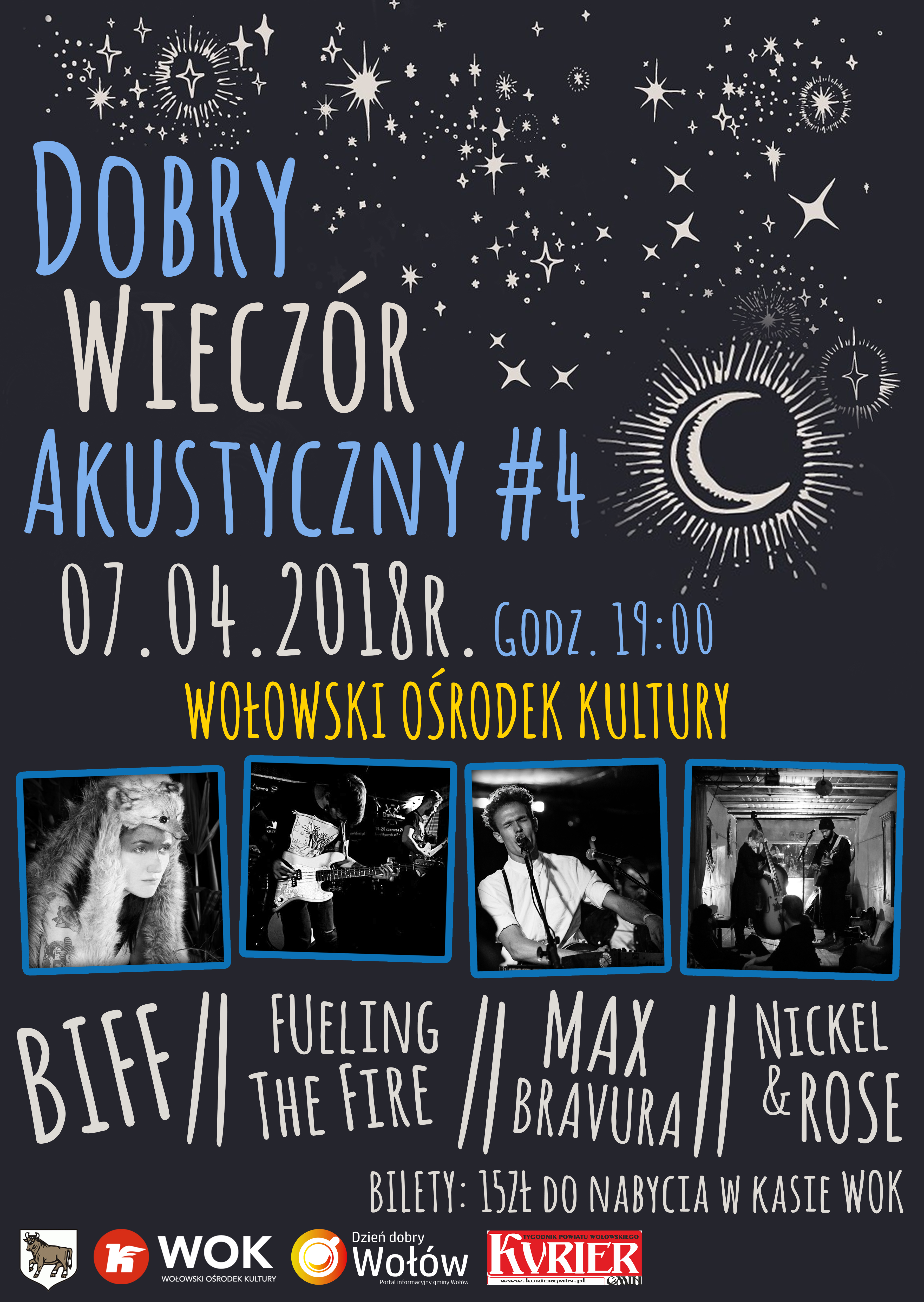 Zapraszamy do zapoznania się z relacją fotograficzną z czwartej edycji Dobrego Wieczoru Akustycznego, która odbyła się w ubiegłą sobotę (7 kwietnia) w sali widowiskowej WOK. Na scenie zaprezentowały się duety w międzynarodowym składzie. Dziękujemy bardzo serdecznie za magię płynąca ze sceny – Nickel and Rose, Fueling The Fire, BIFF oraz Max Bravura. Dziękujemy również przybyłej publiczności za obecność. To była dobra edycja.