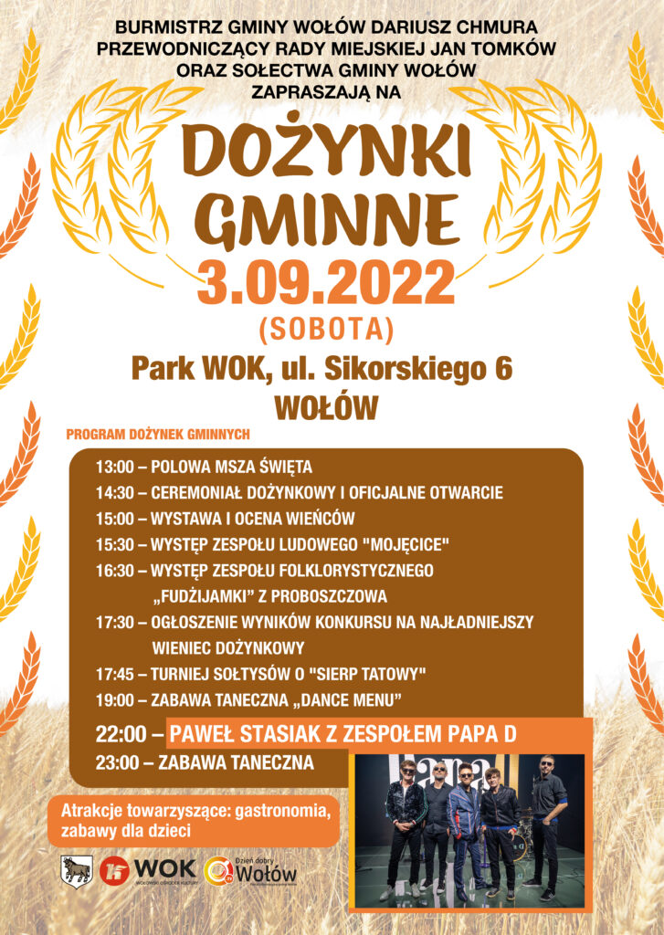Burmistrz Gminy Wołów Dariusz Chmura, Przewodniczący Rady Miejskiej Jan Tomków oraz Sołectwa Gminy Wołów serdecznie zapraszają na na Dożynki Gminne 2022, które odbędą się w dniu 03.09.2022 (sobota) w parku WOK !