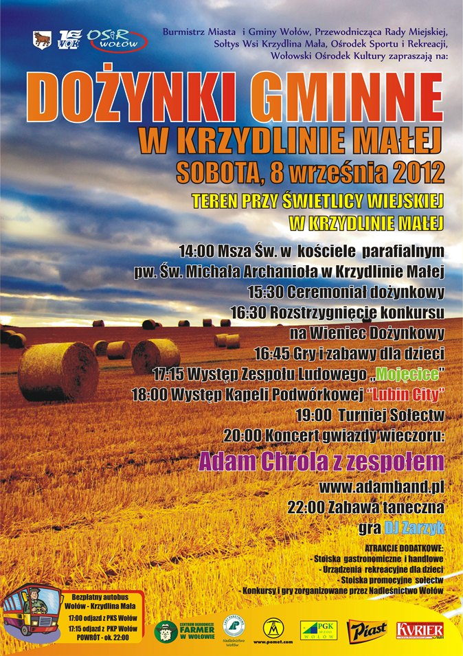 Burmistrz Miasta i Gminy Wołów, Przewodnicząca Rady Miejskiej, Sołtys Wsi Krzydlina Mała, Ośrodek Sportu i Rekreacji, Wołowski Ośrodek Kultury zapraszają na Dożynki Gminne, które w tym roku odbędą się 8 września w Krzydlinie Małej.