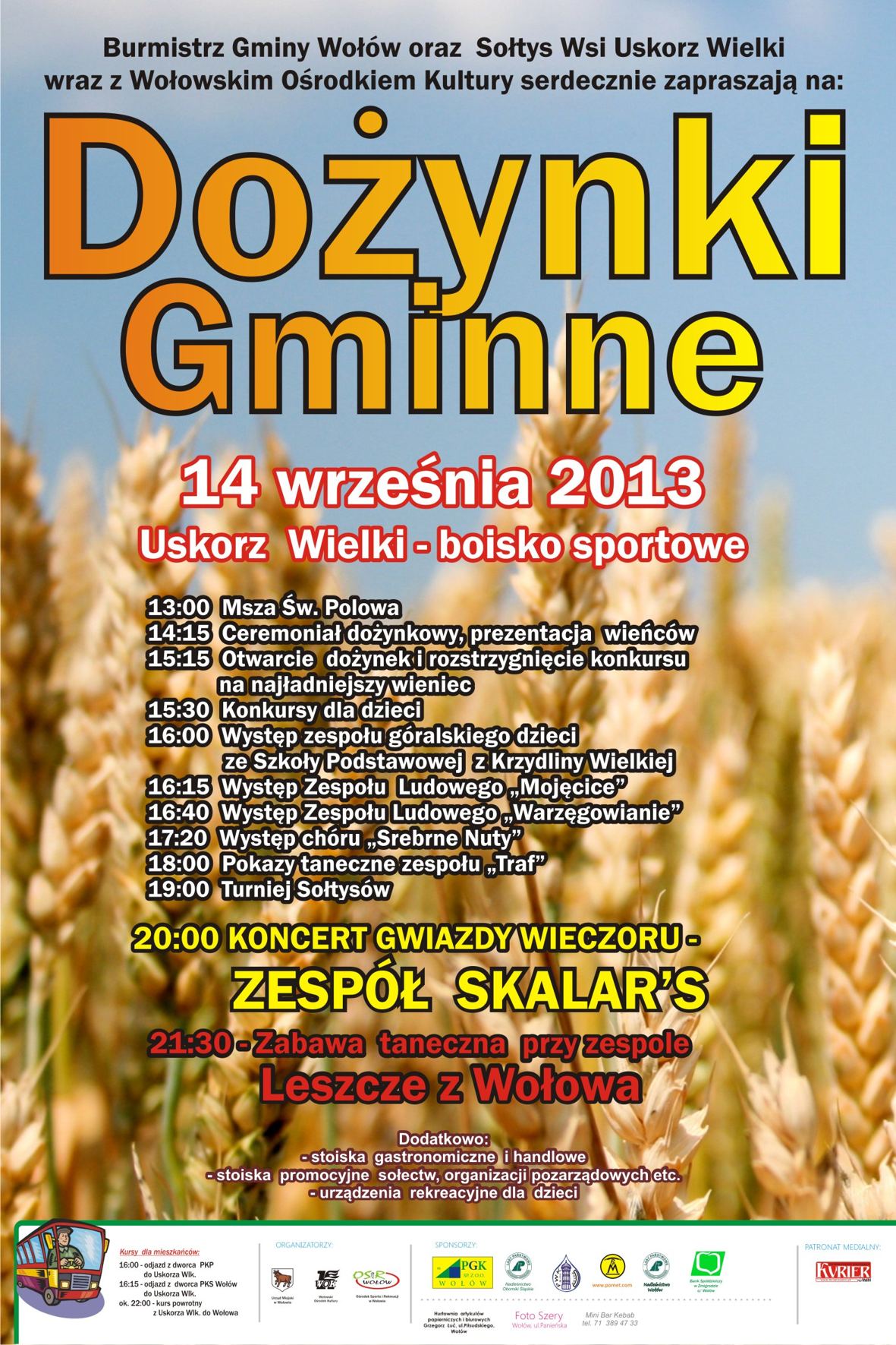 Burmistrz Gminy Wołów oraz Sołtys Wsi Uskorz Wielki wraz z Wołowskim Ośrodkiem Kultury zapraszają na Dożynki Gminne, które w tym roku odbędą się na boisku sportowym w Uskorze Wielkim.