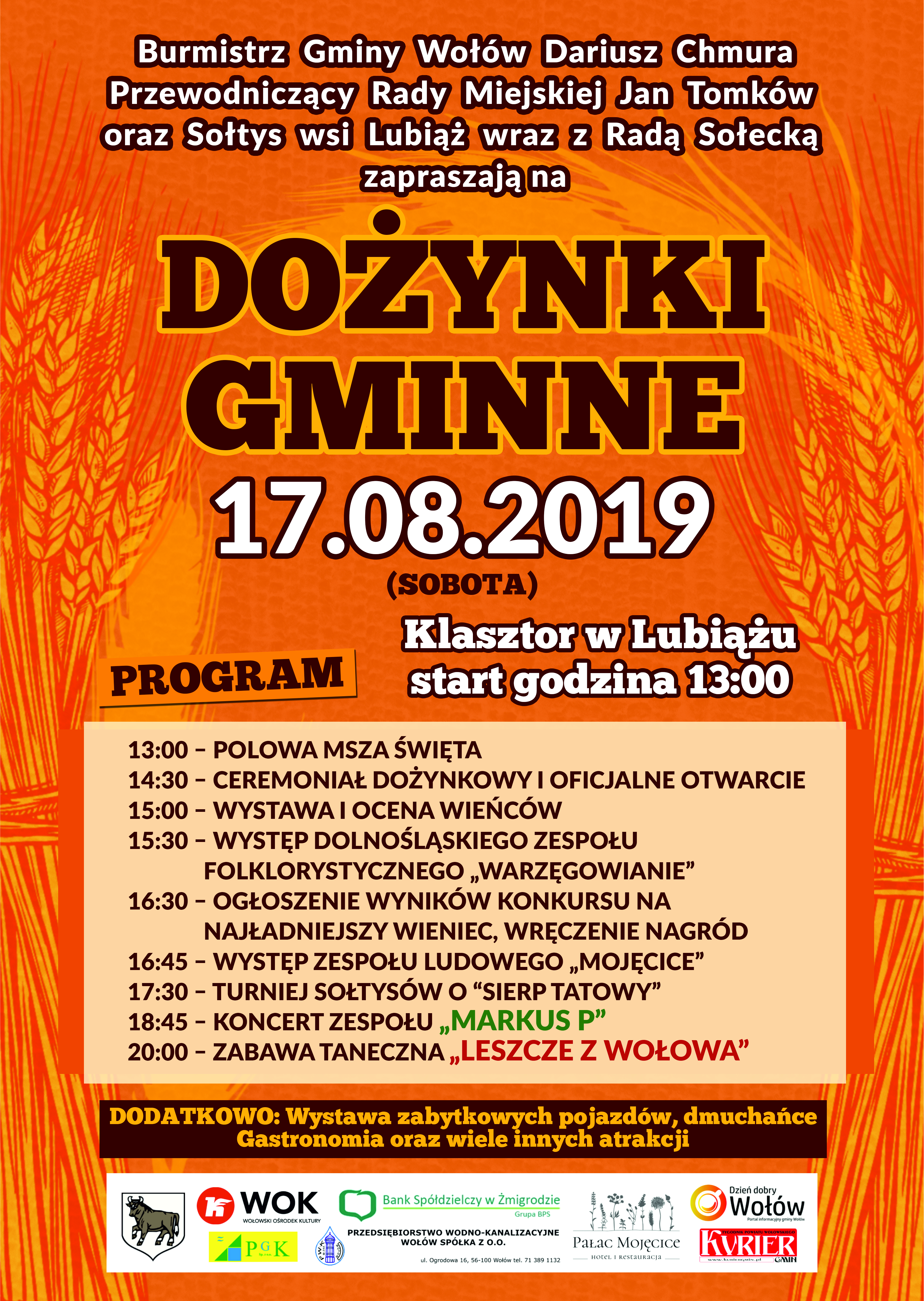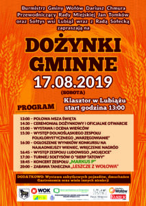 Burmistrz Gminy Wołów – Dariusz Chmura, Sołtys Wsi Lubiąż – Agnieszka Dolat, Wołowski Ośrodek Kultury oraz Ośrodek Sportu i Rekreacji serdecznie zapraszają na Dożynki Gminne, które odbędą się 17 sierpnia 2019 na terenie przy Klasztorze w Lubiążu. Jak co roku odbędą się koncerty zespołów ludowych. Na przybyłych gości czekać będą stoiska z rękodziełem, produktami lokalnymi, gastronomią oraz liczne atrakcje dla dzieci. Gwiazdą Dożynek Gminnych będzie Marcus P.