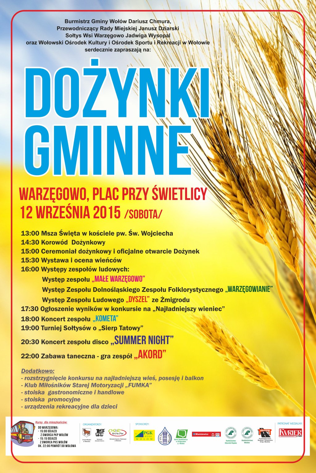 Zapraszamy na tegoroczne Dożynki Gminne do Warzęgowa, które odbędą się w najbliższą sobotę. Szczegółowy program znajduje się na plakacie. Informujemy , że dla mieszkańców Wołowa przewidziany jest dojazd na teren imprezy (wyjazd autokaru do Warzęgowa – godz.15:00 z dworca PKP, 15:15 – z dworca PKS; orientacyjny powrót z Warzęgowa – ok. godz. 22:00)