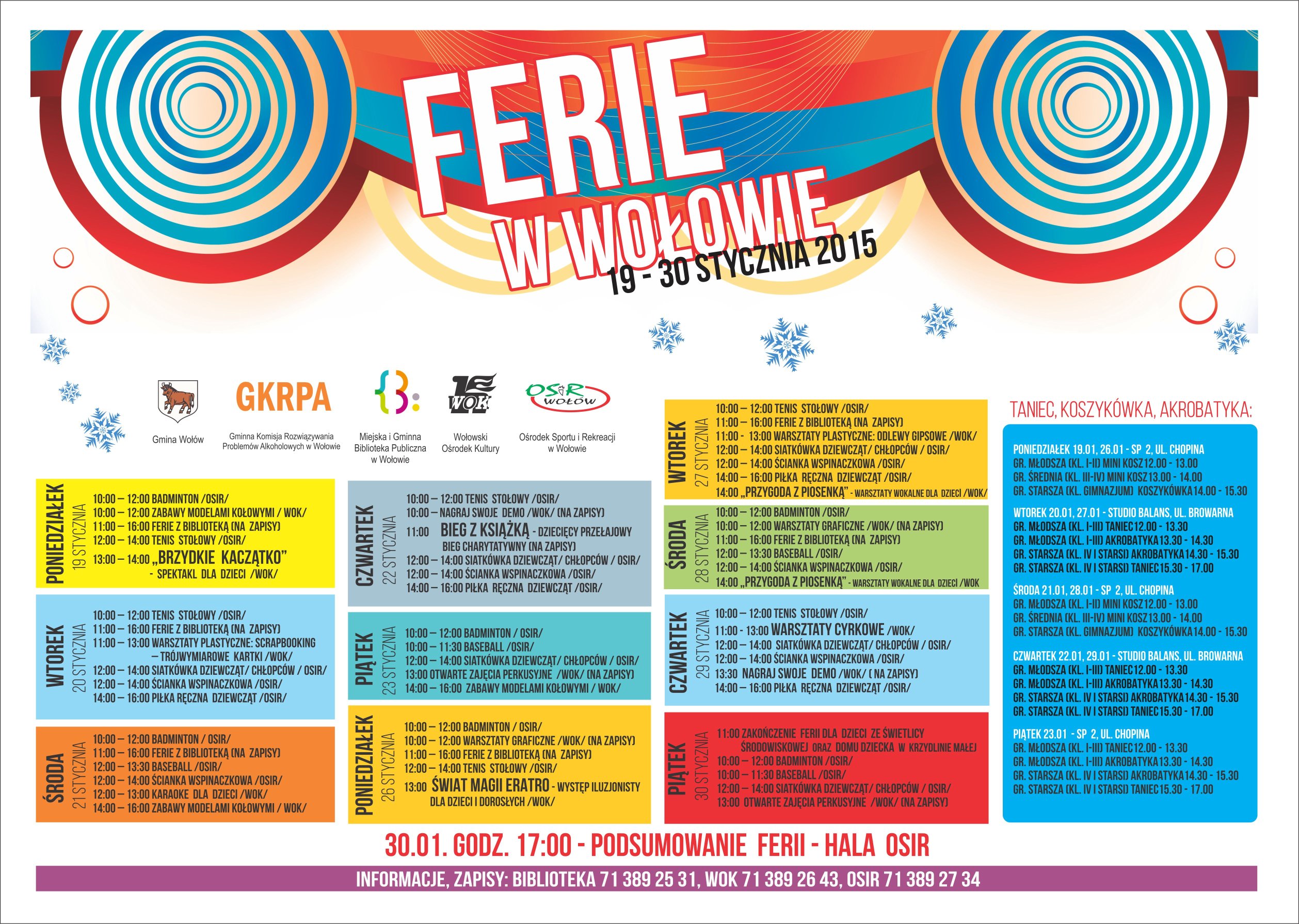 Prezentujemy Państwu pełną ofertę zajęć, warsztatów, imprez i wydarzeń sportowych przygotowaną przez Wołowski Ośrodek Kultury, Miejską i Gminną Bibliotekę Publiczną oraz Ośrodek Sportu i Rekreacji przy wsparciu Urzędu Miejskiego oraz Gminnej Komisji Rozwiązywania Problemów Alkoholowych w Wołowie. Mamy nadzieję, że tegoroczny wachlarz propozycji spotka się z licznym zainteresowaniem ze strony Państwa pociech.