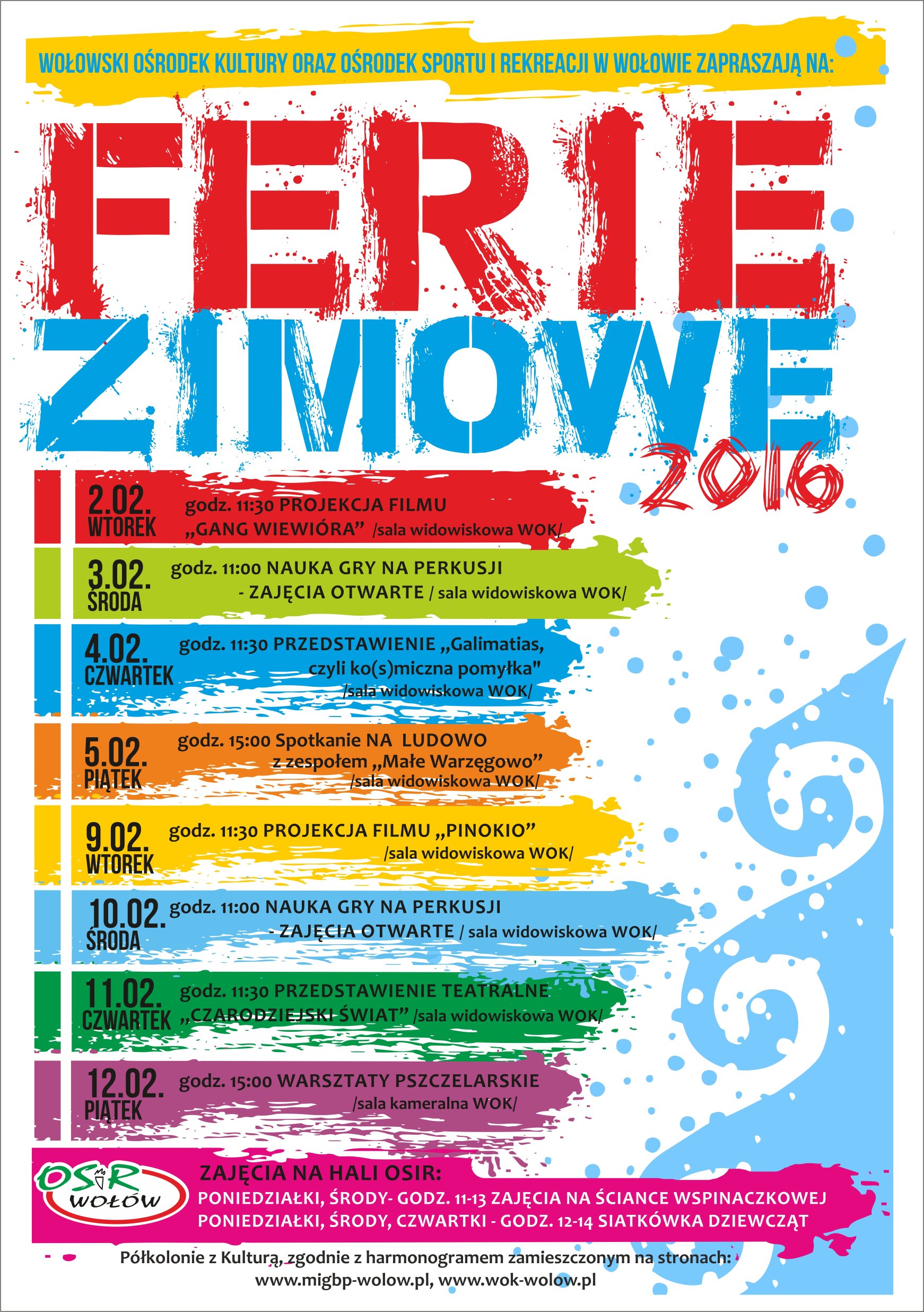 Ferie zimowe, podczas ktorych można było skorzystać z oferty kulturalnej- już za nami. Dużą popularnością cieszyły się seanse filmowe – „Gang Wiewióra” i „Pinokio”, na których sala widowiskowa pękała w szwach, a rodzice musieli zadowolić się miejscami stojącymi:) Podobały się także spektakle „Galimatias czyli ko(s)miczna pomyłka” oraz „Czarodziejski Świat”. Można było spróbować swoich sił na perkusji podczas otwartych zajęć perkusyjnych a także poznać jak wygląda działalność i zajęcia Zespołu Ludowego „Małe Warzęgowo.” Wyjątkowo było również podczas warsztatów pszczelarskich.
