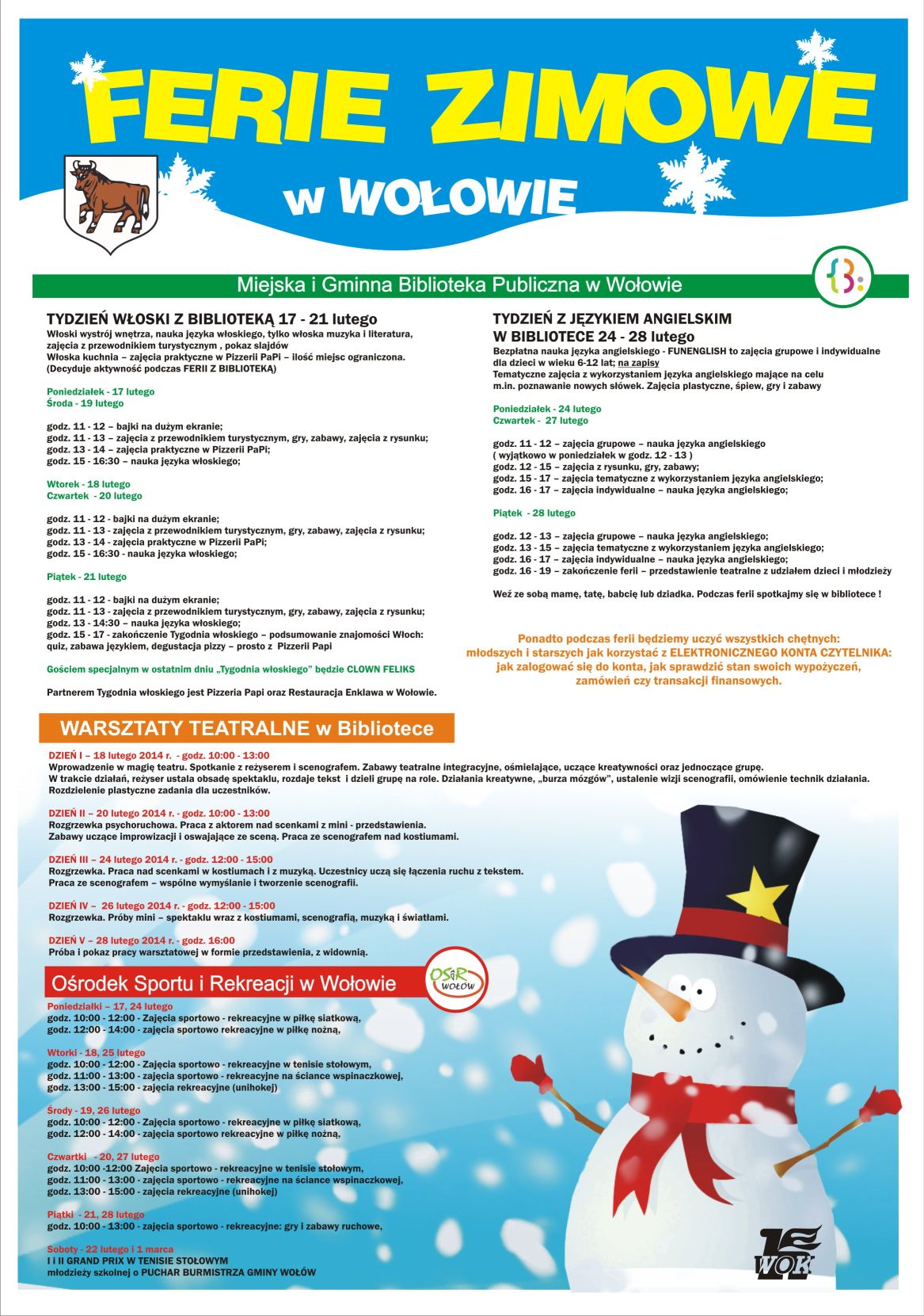 Zapraszamy na ferie w Wołowie. Prezentujemy plan zajęć przygotowanych przez gminne placówki oraz Urząd Miejski w Wołowie.