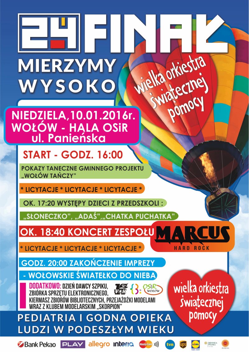 Kolejny, 24 już finał WOŚP odbędzie się w niedzielę, 10.01.2016 r. Tym razem Orkiestra będzie zbierała pieniądze na zakup urządzeń medycznych dla oddziałów pediatrycznych oraz dla zapewnienia godnej opieki medycznej seniorów. Tradycyjnie, oprócz kwestujących na ten cel wolontariuszy skupionych przy wołowskim sztabie, odbędzie się impreza na hali OSiR przy ul. Panieńskiej. Start o godz. 16:00. W programie: pokazy taneczne w ramach gminnego projektu „Wołów tańczy”, występy dzieci z wołowskich przedszkoli „Słoneczko”, „Chatka Puchatka” i „Adaś”. Około godz. 18:40 wystąpi hard-rockowy zespół Marcus, a o 20:00 zaświecone zostanie wołowskie „Światełko do nieba”.