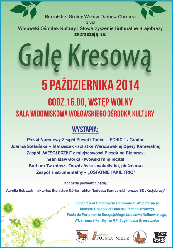 Burmistrz Gminy Wołów wraz z Wołowskim Ośrodkiem Kultury oraz Stowarzyszeniem Kulturalnym „Krajobrazy” zaprasza na Galę Kresową, która odbędzie się w niedzielę, 5 października o godz. 16:00 w sali widowiskowej WOK. Serdecznie zapraszamy! Wstęp wolny.