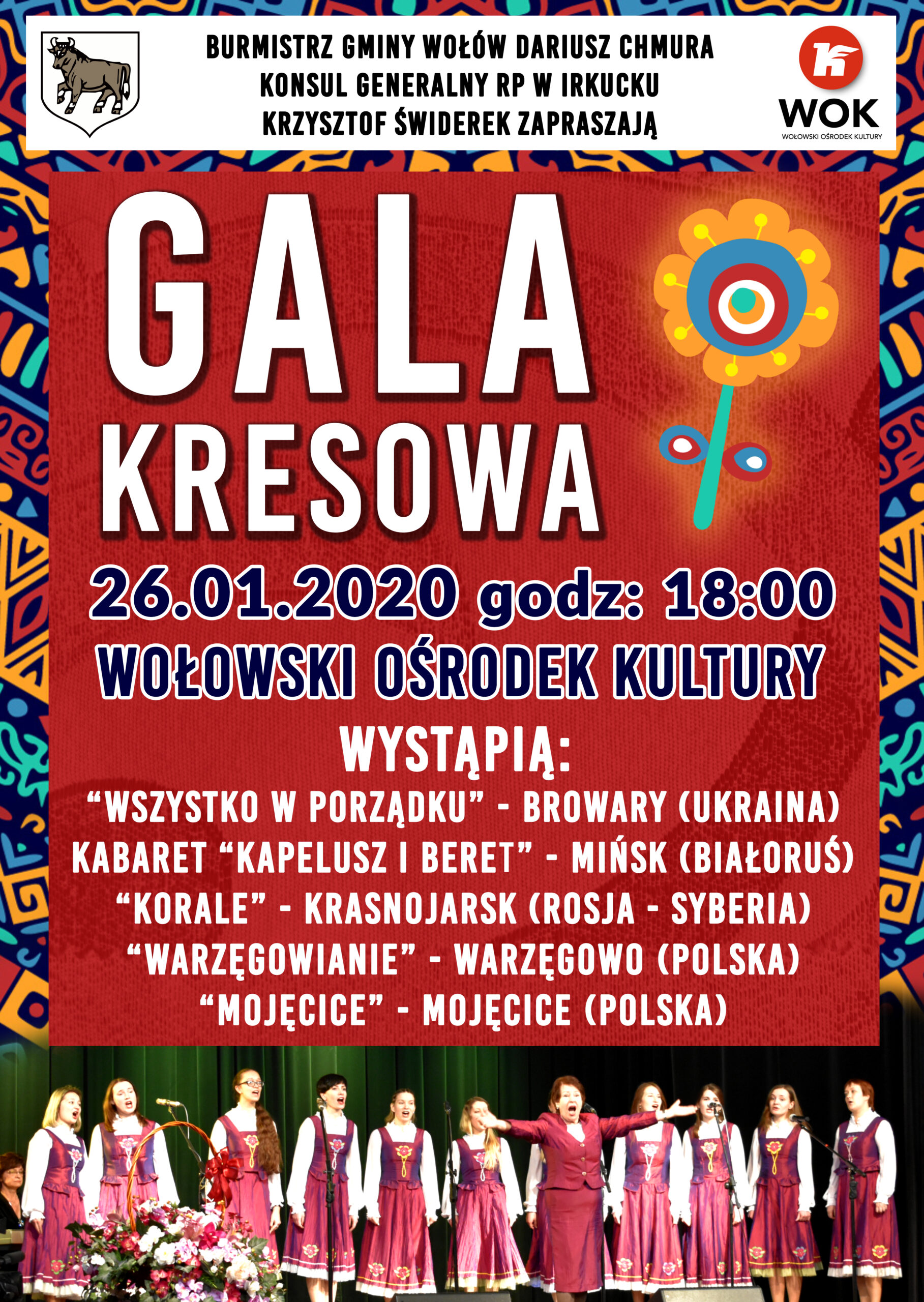 26 stycznia (niedziela) o godz. 18:00 w sali widowiskowej Wołowskiego Ośrodka Kultury odbędzie się kolejna edycja GALI KRESOWEJ z udziałem artystów z Ukrainy, Białorusi, Rosji oraz Polski. Organizatorami koncertu są: Burmistrz Gminy Wołów – Dariusz Chmura, Konsul Generalny RP w Irkucku Krzysztof Świderek.