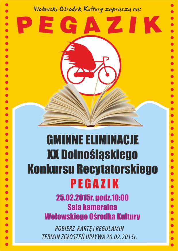 Tradycyjnie w lutym zapraszamy wszystkich chętnych do wzięcia  udziału w kolejnej edycji Konkursu Recytatorskiego „Pegazik”. Gminne  eliminacje  odbędą się w sali kameralnej Wołowskiego Ośrodka Kultury w  dn. 25.02. o godz. 10:00. Zgłoszenia przyjmujemy  do dn. 20.02. Karta  zgłoszenia  i  regulamin do pobrania  TUTAJ.