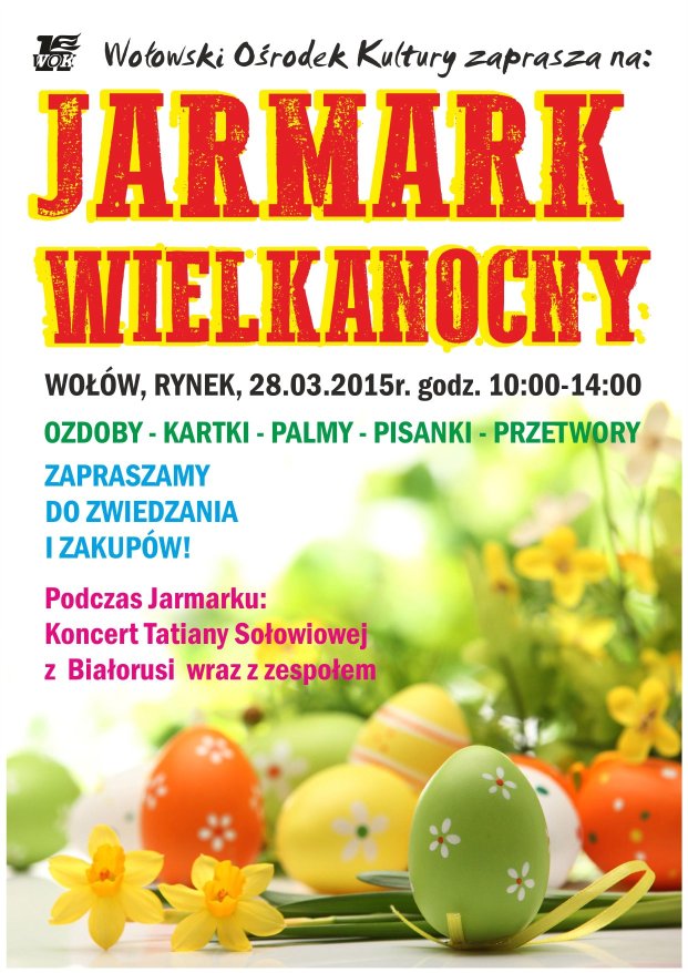 Tegoroczny Jarmark Wielkanocny odbędzie się w najbliższą sobotę, 28 marca o godz. 10:00 na wołowskim Rynku. Na kilkunastu stoiskach będzie można zakupić ozdoby świąteczne, kartki, przetwory i inne. Czas spędzony na jarmarku umili występ zespołu Tatiany Sołowiejowej z Białorusi. Serdecznie zapraszamy do odwiedzin w godz. 10:00 – 14:00.