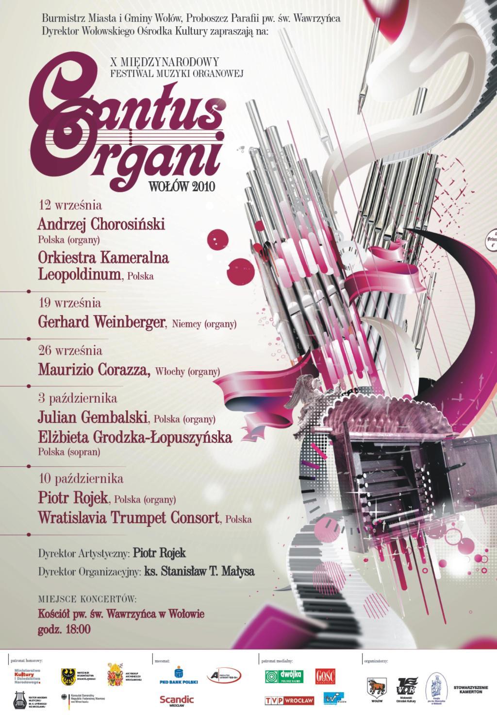 Serdecznie zapraszamy Państwa na dziesiątą, jubileuszową edycję Międzynarodowego Festiwalu Muzyki Organowej „Cantus Organi”. Tradycyjnie koncerty festiwalowe odbywać się będą w kościele pw. św. Wawrzyńca w Wołowie w niedziele, o godz. 18:00. Serdecznie zapraszamy!