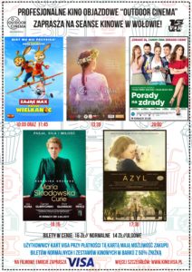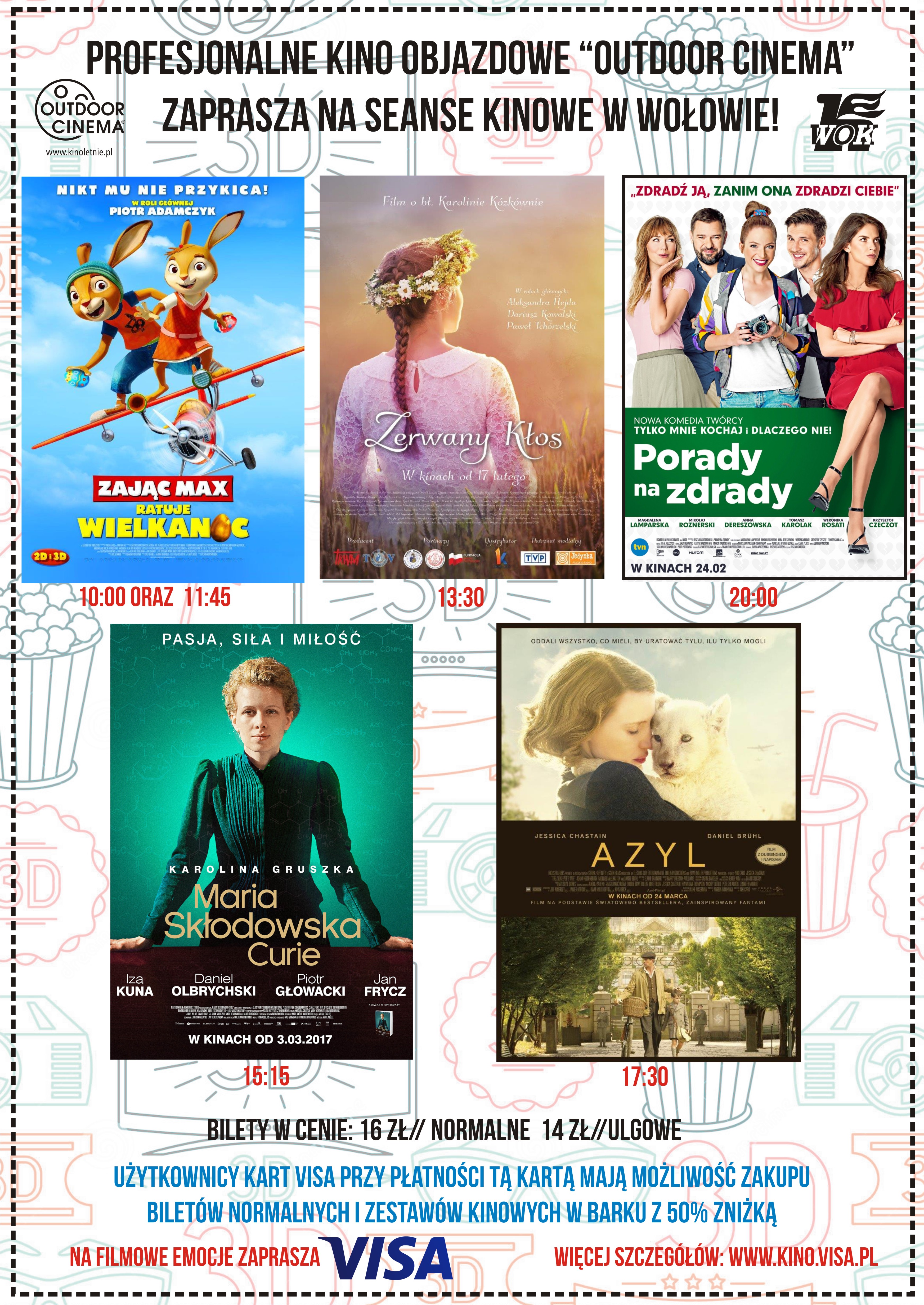 8 kwietnia 2017 roku do Wołowa ponownie zawita kino objazdowe „Outdoor Cinema”! W tym dniu na sali widowiskowej będzie można zobaczyć aż pięć gorących tytułów tej wiosny – a będą to: „Zając Max”, „Zerwany Kłos”, „Maria Curie”, „Azyl” oraz „Porady na zdrady”, a godziny seansów przedstawiają się następująco: 10:00, 11:45, 13:30, 15:15, 17:30 oraz 20:00.