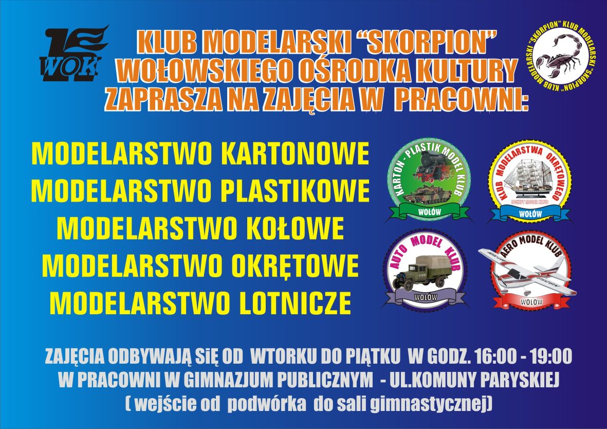 Klub Modelarski „Skorpion” serdecznie zaprasza  na zajęcia. Na czas remontu Wołowskiego Ośrodka Kultury  będą sie one odbywać  w Gimnazjum Publicznym w Wołowie  – ul. Komuny Paryskiej – wejście  od  podwórza  do sali gimnastycznej. Serdecznie zapraszamy!