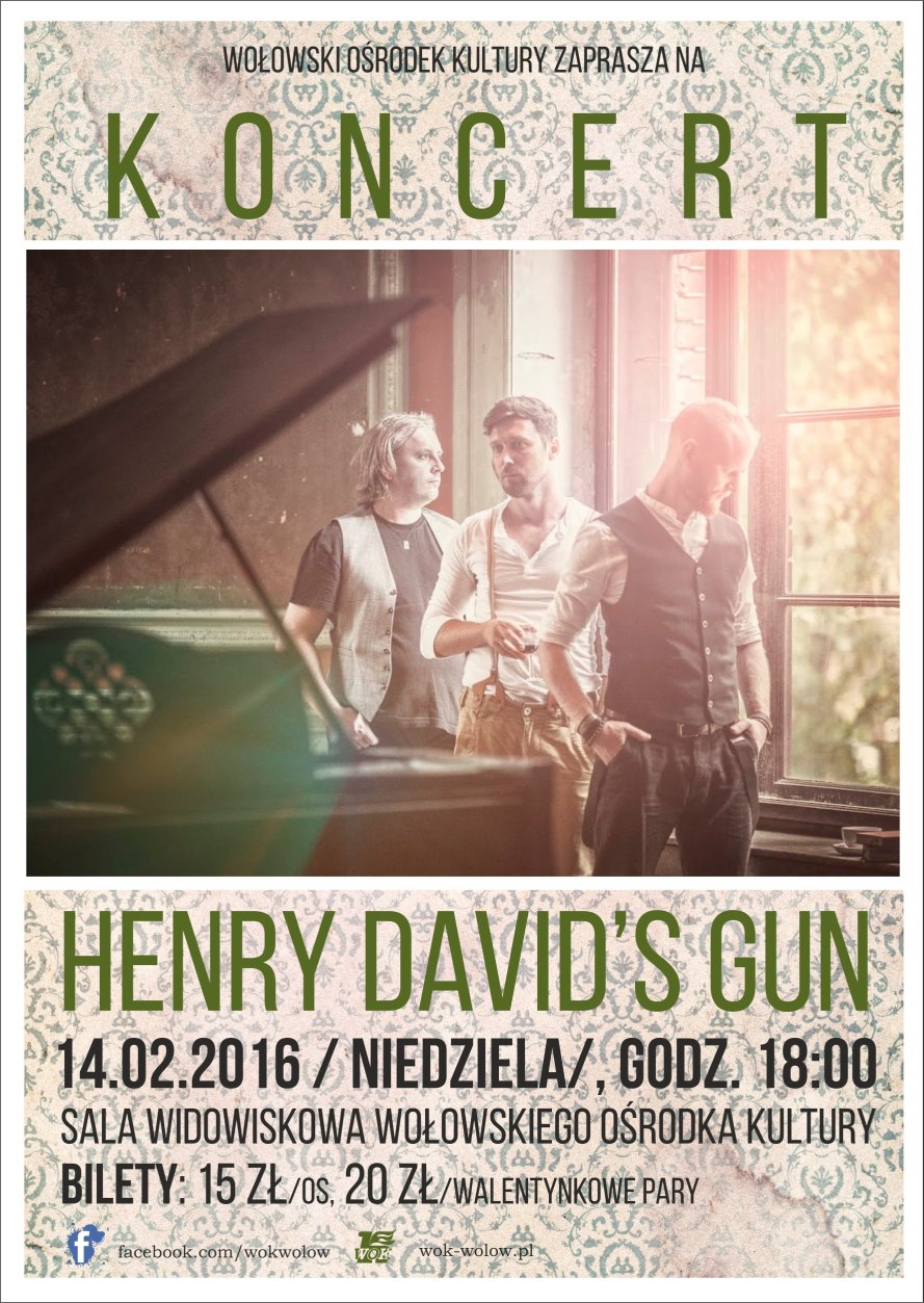 „Nie wiem czy nasza muzyka nadaje się na walentynki, ale życzę wszystkim miłego wieczoru” – takimi słowami rozpoczął koncert swojego zespołu wokalista – Wawrzyniec Dąbrowski. W istocie, był to wieczór pełen miłych, nastrojowych i przejmujących dźwięków stworzonych przez trio za pomocą gitary, kontrabasu, instrumentów perkusyjnych, banjo, ukulele i pianina. Henry David’s Gun wołowskim koncertem promował swoją płytę „Over The Fence … And Far Away”. Ponad godzinny występ zakończyły bisy, wspólne zdjęcia i rozmowy z muzykami. Oprócz dźwiękowej uczty na widzów czekała kawa, herbata, ciastka i lampka wina.