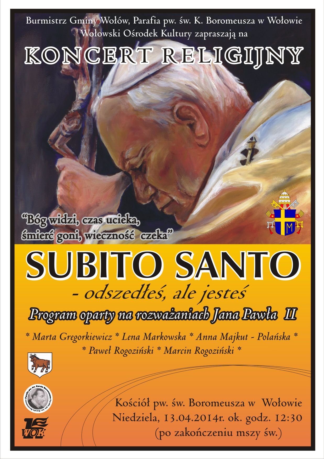 Wspólnie z Burmistrzem Gminy Wołów oraz parafią pw. św. K. Boromeusza serdecznie zapraszamy na koncert religijny „Subito Santo”. Odbędzie się on w niedzielę, 13.04.2014r. o godz. 12:30w kościele pw. św. K. Boromeusza w Wołowie. Wśród wykonawców: Marta Gregorkiewicz, Lena Markowska, Anna Majkut- Polańska, Paweł Rogoziński, Marcin Rogoziński. Wstęp wolny.