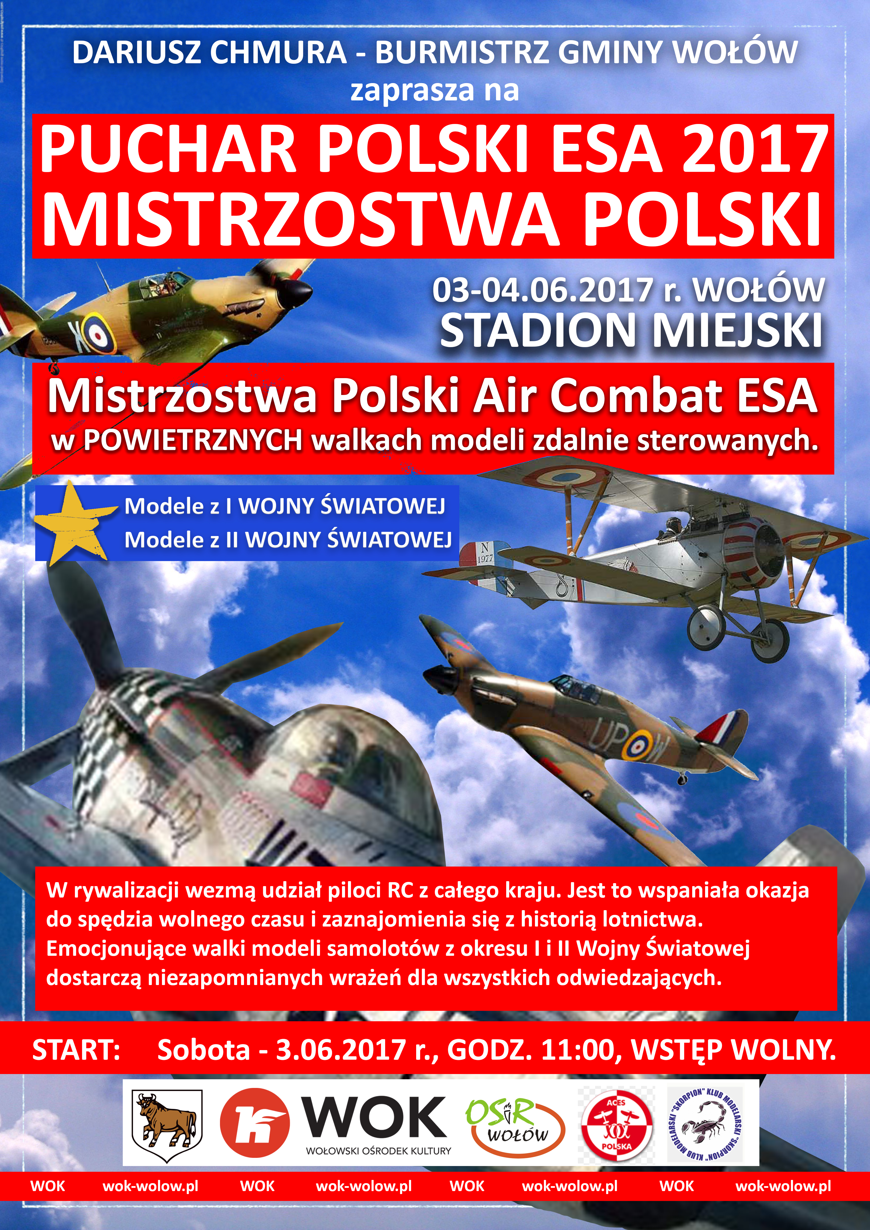 Burmistrz Gminy Wołów Dariusz Chmura zaprasza bardzo serdecznie  na Mistrzostwa Polski Air Combat ESA w POWIETRZNYCH walkach modeli zdalnie sterowanych. Impreza odbędzie się w dn. 03-04.06.23017r. na Stadionie Miejskim w Wołowie. Start wydarzenia o godz. 11:00.