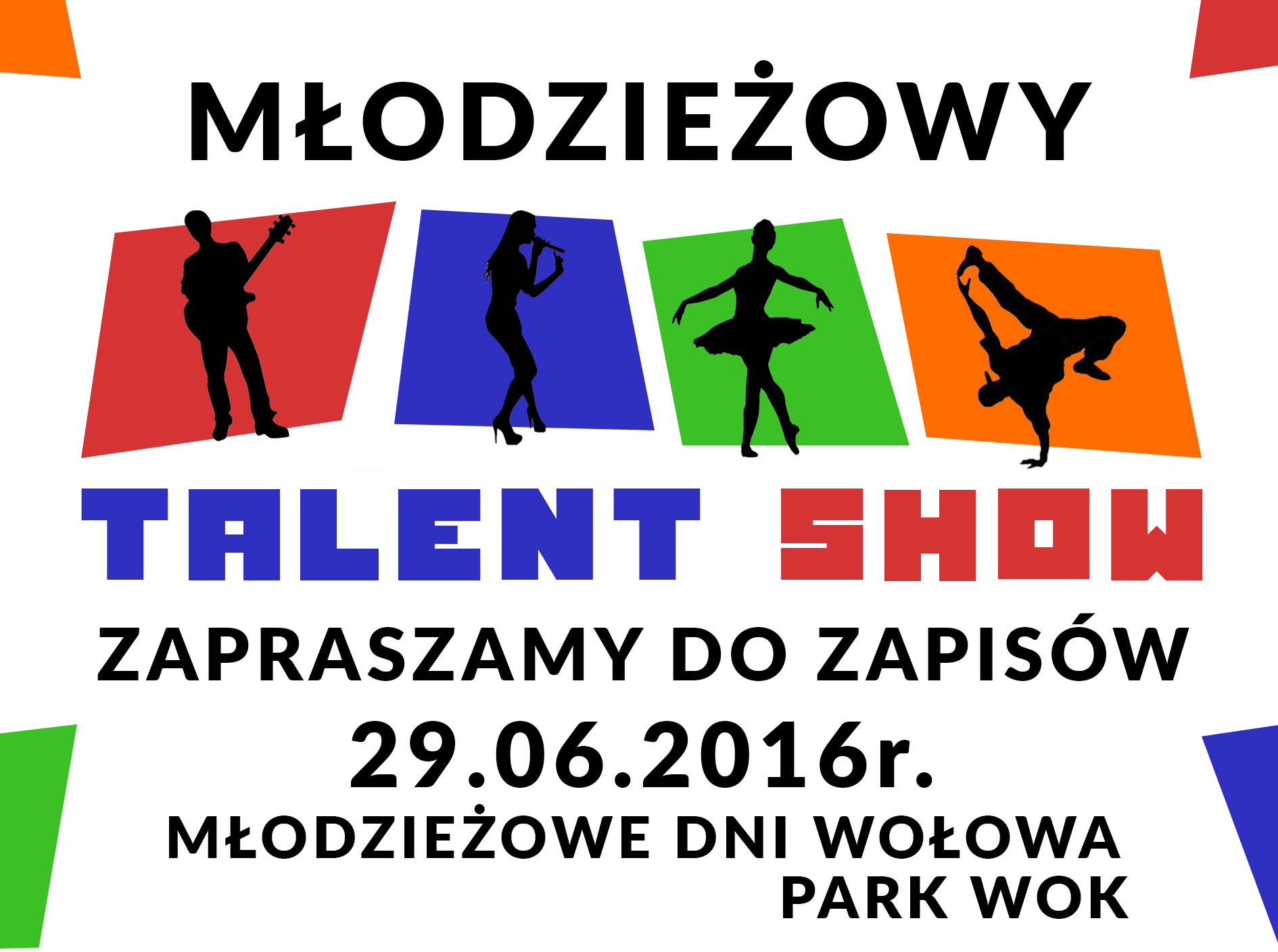 ie zapraszamy chętnych w wieku od 13 do 19 roku życia, do udziału w konkursie „Młodzieżowy Talent Show”. Poszukujemy TALENTÓW wszelakich! Jeśli chcesz się pochwalić, że: tańczysz, śpiewasz, recytujesz, żonglujesz itp. Zgłoś się do nas. Do 22.06.2018 (piątek) czekamy na zgłoszenia. Przesłuchania konkursowe odbędą się w sali kameralnej WOK w dniu 26.06.2018 (wtorek) o godz 10:00. Finaliści konkursu wystąpią podczas Młodzieżowych dni Wołowa. Szczegółowe informacje podane w regulaminie.