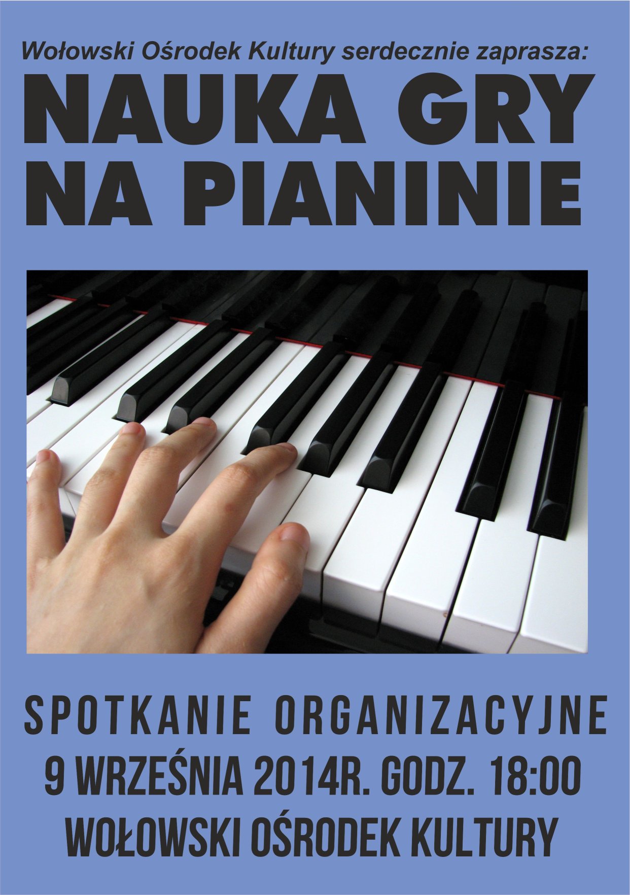 Zapraszamy wszystkich chętnych na spotkanie organizacyjne w sprawie nauki gry na pianinie w roku szkolnym 2014/2015. Odbędzie się ono we wtorek, o godz. 18:00 w sali Wołowskiego Ośrodka Kultury.
