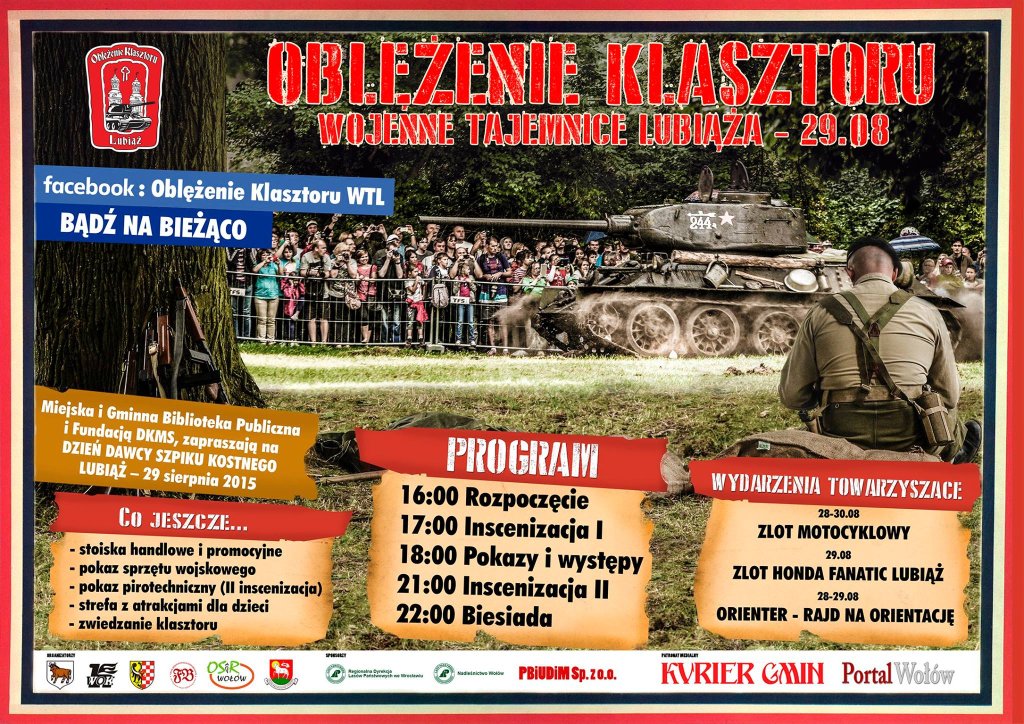 Jako współorganizator  Oblężenia  Klasztoru, serdecznie zapraszamy  na kolejną  edycję tej  imprezy. Szczegóły na plakacie.