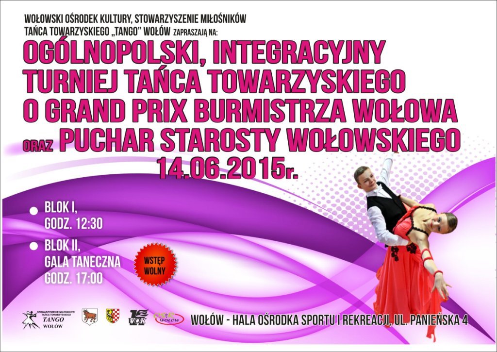 Wszystkich miłośników tańca serdecznie zapraszamy na Ogólnopolski, Integracyjny Turniej Tańca Towarzyskiego o Grand Prix Burmistrza Wołowa oraz Puchar Starosty Wołowskiego. Turniej odbędzie się w niedzielę, 14 czerwca w hali OSiR przy ulicy Panieńskiej. Blok I zaczynamy o godz. 12:30, Blok II, Gala Taneczna – o godz. 17:00. Wstęp wolny!