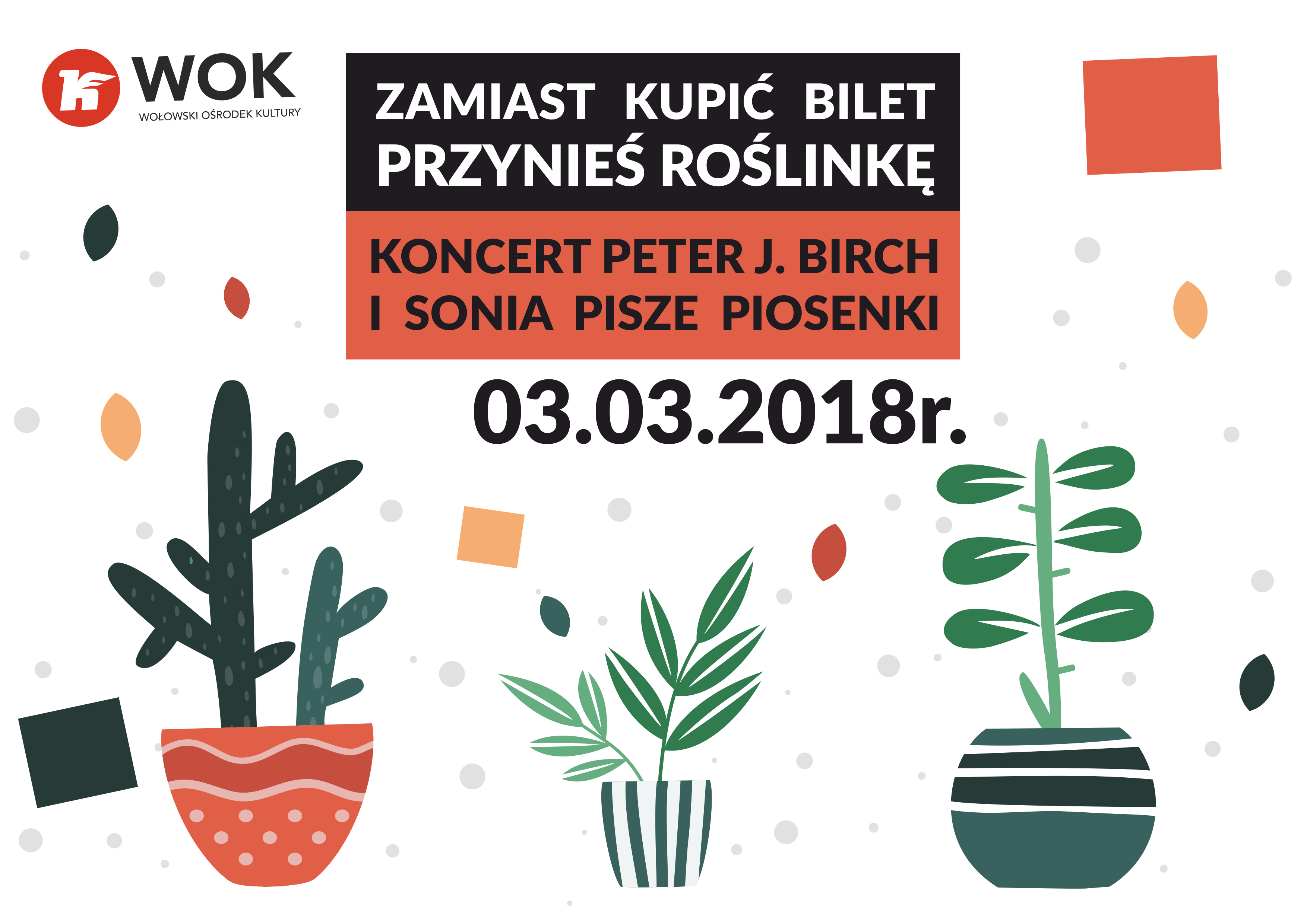 3 marca 2018r. w sali kameralnej WOK odbył się koncert w wykonaniu naszego lokalnego artysty Piotra Brzezińskiego – szerszej publiczności znanego jako Peter J.Birch oraz Soni Pisze Piosenki – czyli duetu Soni i Kasi. Tym wydarzeniem rozpoczęła się ich wspólna trasa koncertowa po Polsce. Był to naprawdę wyjątkowy wieczór, pod wieloma względami, nie tylko muzycznymi 🙂 Dziękujemy za każdą przekazaną roślinkę -cieszymy się, że tyle osób zechciało przyłączyć się do akcji „zaszczep w sobie kulturę”. Obiecujemy, że będziemy o nie dbać z całego serca. W wolnej chwili zapraszamy do WOK na roślinny rekonesans 🙂