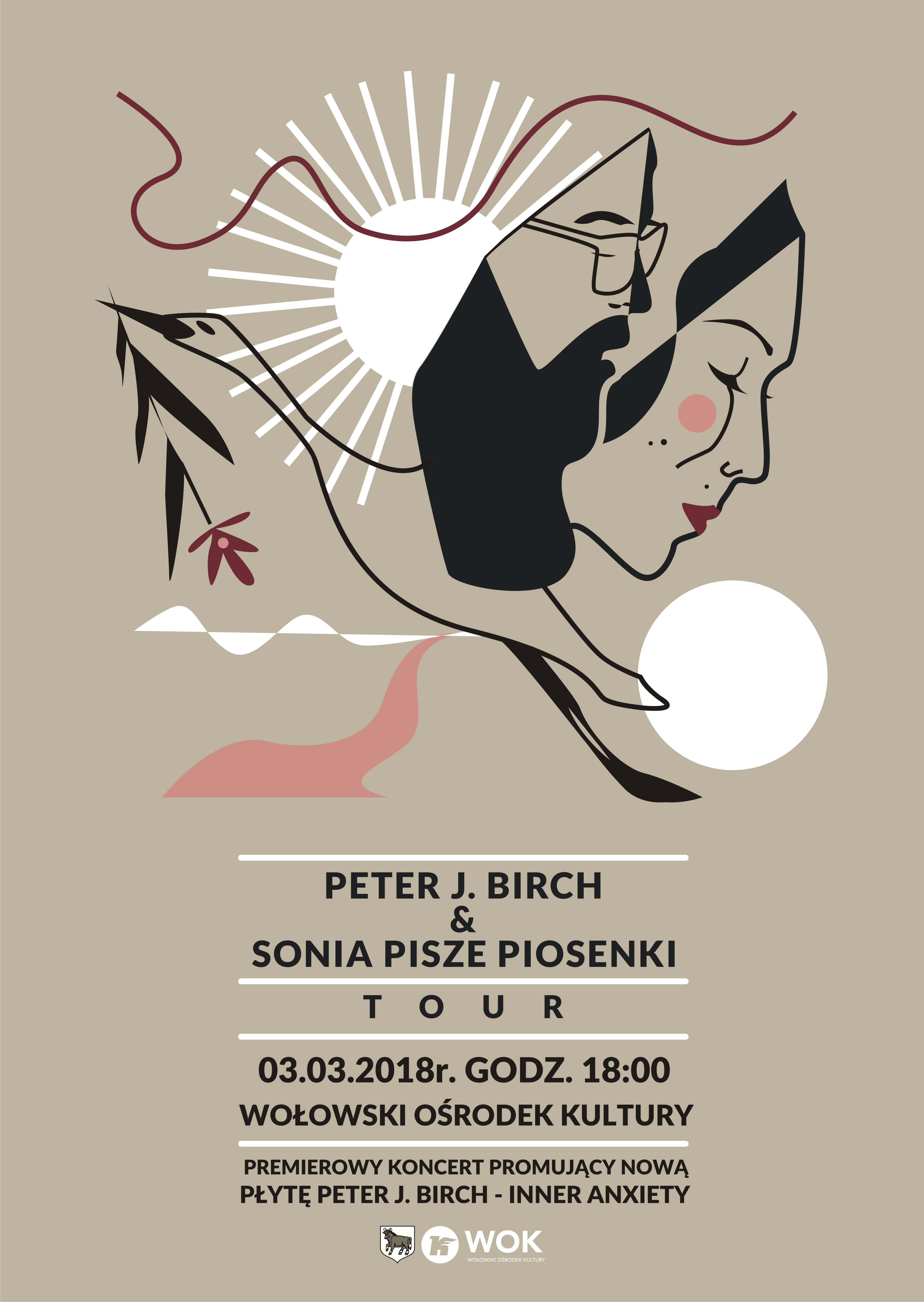 Wołowski Ośrodek Kultury zaprasza na wspólny koncert lokalnego artysty Piotrka Brzezińskiego, szerszej publiczności znanego jako Peter J.Birch oraz Sonia Pisze Piosenki, który odbędzie się 3 marca 2018 w sali kameralnej Wołowskiego Ośrodka Kultury o godz. 19:00.