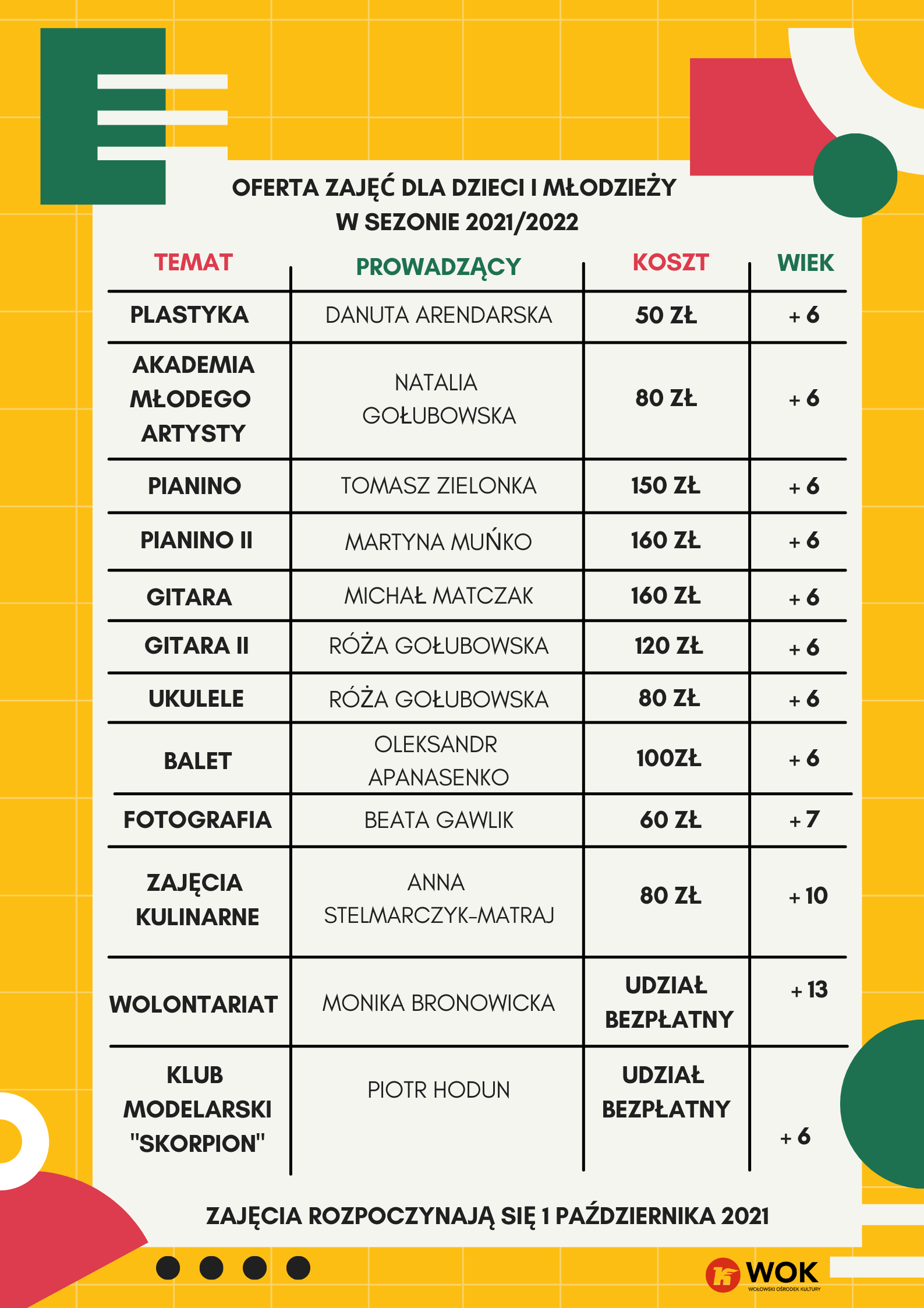Jak co roku przygotowaliśmy dla Państwa szeroką ofertę zajęć rozwijających umiejętności artystyczne i nie tylko. Z nami nauczysz się grać na gitarze, pianinie oraz ukulele! Zapraszamy do udziału w sekcjach plastycznych, Akademii Młodego Artysty czy sekcji kulinarnej. Czekamy na dzieci, młodzież ale również dorosłych.