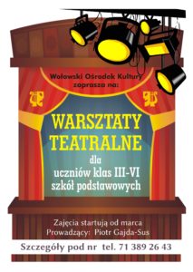 Serdecznie zapraszamy do zapisów na warsztaty teatralne, które rozpoczną się tuż po feriach. Zajęcia przeznaczone są dla uczniów szkół podstawowych klas III-VI.